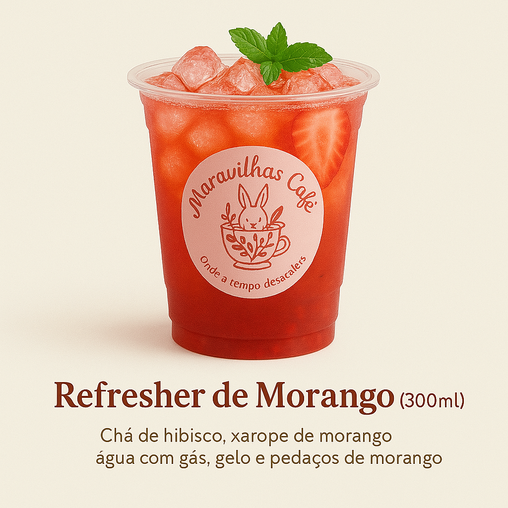 Refrescante, leve e naturalmente doce — o Refresher de Morango é a pedida perfeita para qualquer momento do dia. Feito com ingredientes frescos e pensado para trazer equilíbrio entre sabor, aroma e beleza. Ingredientes: Chá de hibisco gelado (ou chá branco, conforme a versão) Xarope artesanal de morango Água com gás ou filtrada Gelo em cubos Morangos frescos em pedaços Raminho de hortelã para decorar (opcional)