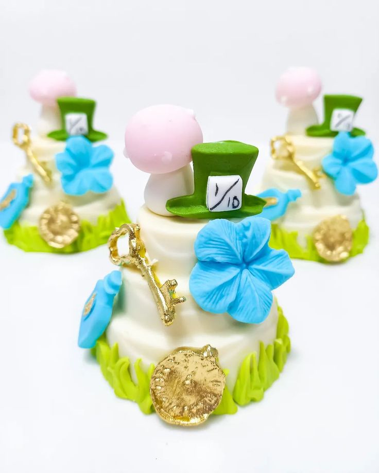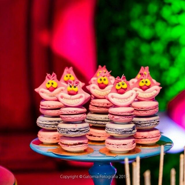 Delicados e coloridos, os macarons inspirados em Alice no País das Maravilhas são verdadeiras obras de arte açucaradas. Cada macaron possui uma casquinha crocante por fora e um recheio cremoso por dentro, combinando sabores suaves como baunilha, framboesa, pistache e chocolate branco. A decoração é meticulosa, trazendo ilustrações pintadas à mão e detalhes em glacê real. Alguns macarons apresentam o rosto sorridente do Gato de Cheshire, com seus olhos penetrantes e um sorriso largo que parece brilhar no doce. Outros exibem o Chapeleiro Maluco, com seu icônico chapéu verde